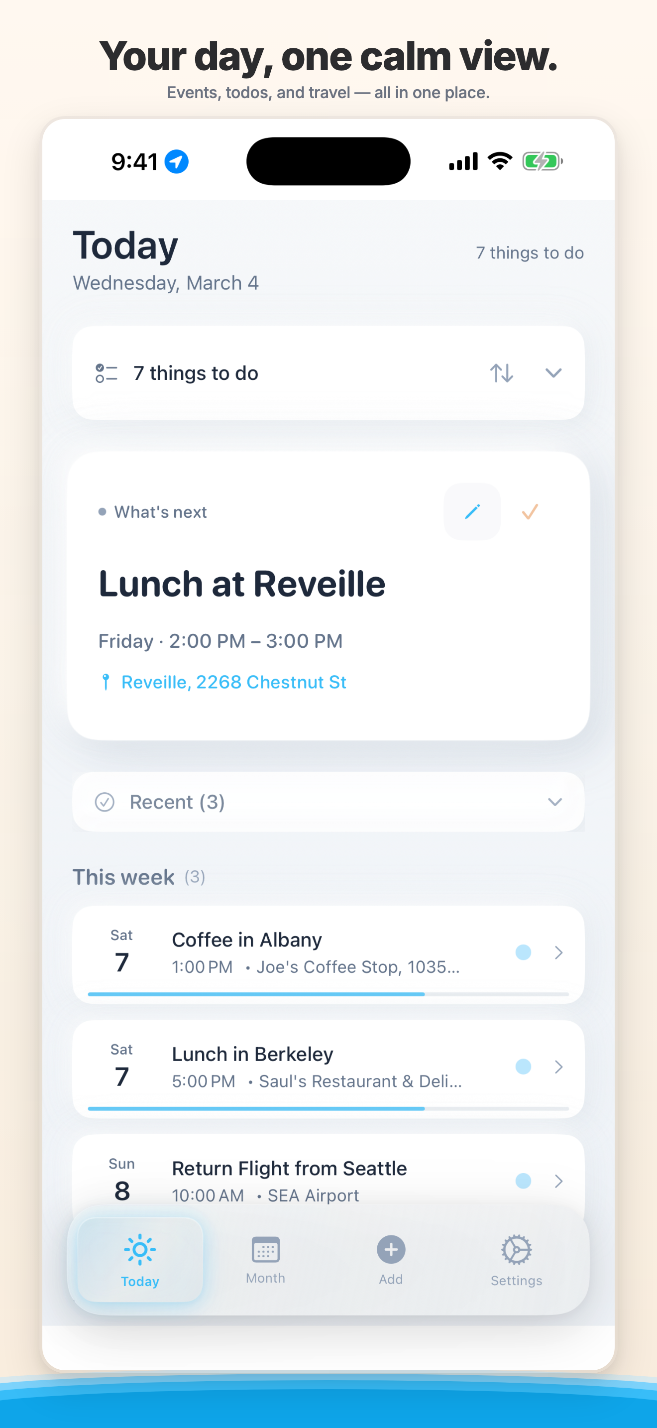 Composed now syncs with Google Calendar. See your work meetings, personal events, and everything else in one calm view — with smart reminders and departure alerts on top.